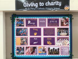 Each year our Mini Vinnies organise a 10p fundraiser challenge. Children and families are challenged to bring in 10p for each week during Lent and add it to their class collection box. The money is counted each week and the totaliser display in the hall is updated to track how may meals can be provided with the funds.